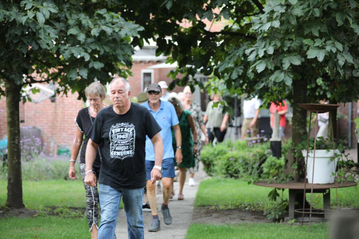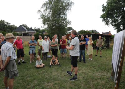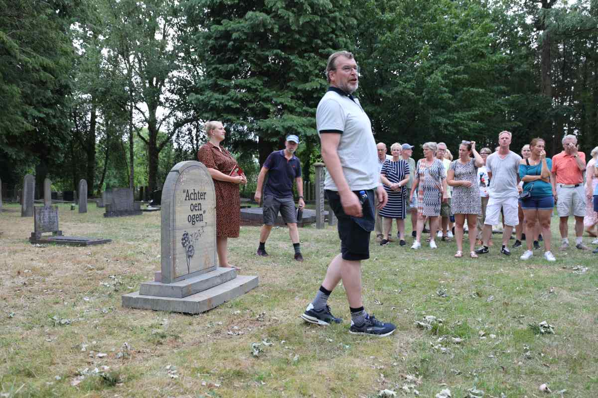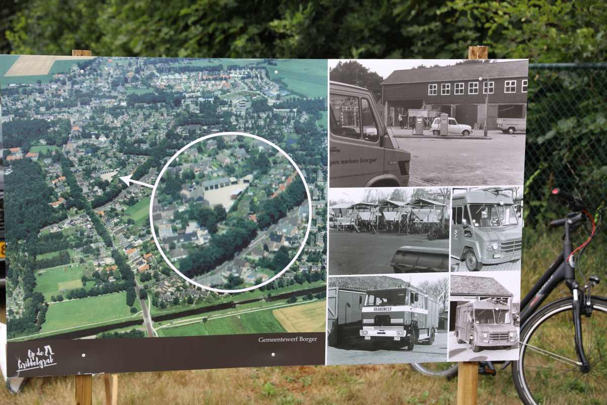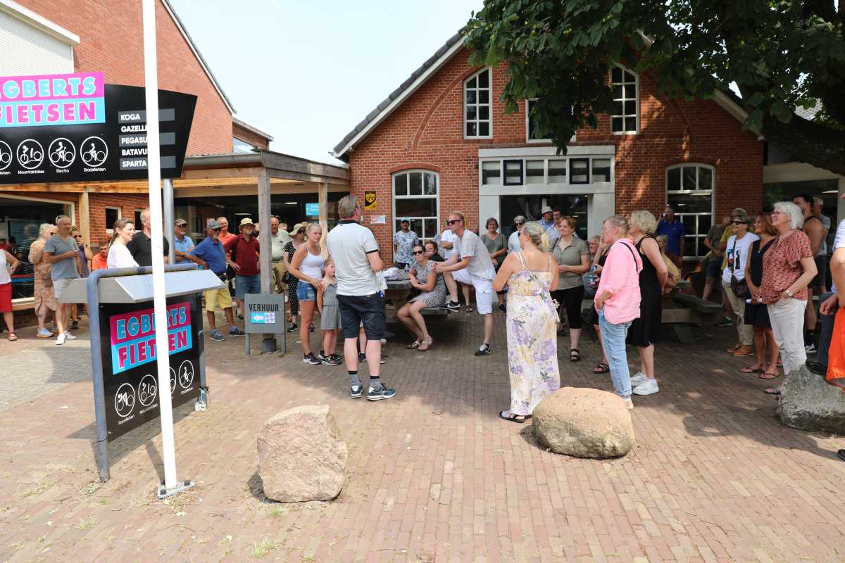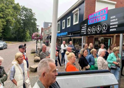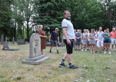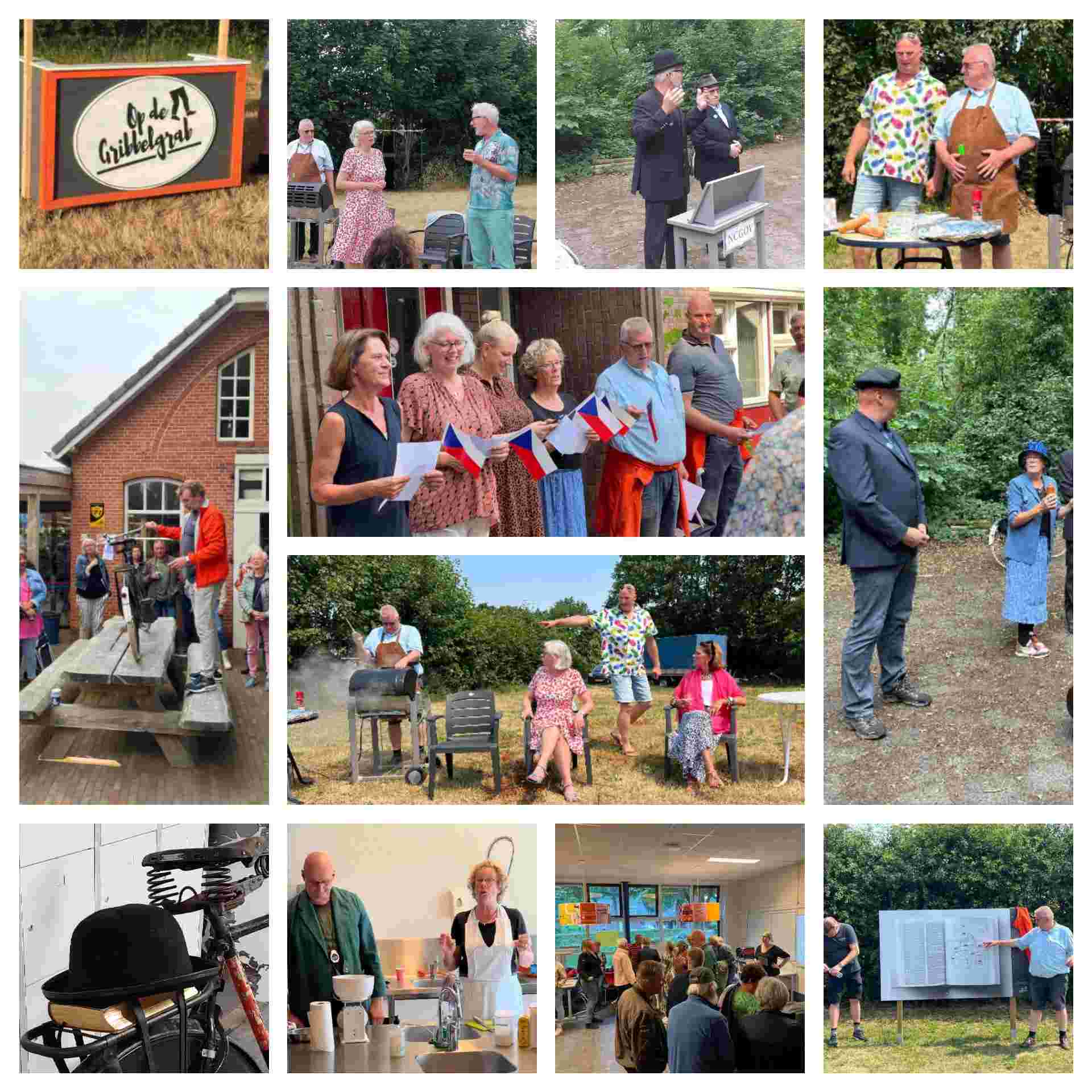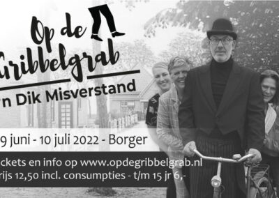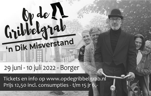 Deze Opdegribbelgrab was een tocht van maximaal 2 km en onderweg namen wij het publiek mee in sketches, poëzie en historische bijzonderheden. De route liep vanaf Egberts Fietsen via het Esdal College, het Padenbos, de begraafplaats, de tuin van Lammie Joling, de tuin van Peter Jan Eleveld en Ayolt van der Kamp, de voormalige gemeentewerf (met de tradionele Opdegribbelgrab-borrel), de tuin van familie de Vries en de tuin van familie Ties. Via het achterom bij Egberts Fietsen gingen we daarna naar de Esdal College (voormalige MAVO/MULO/ULO).