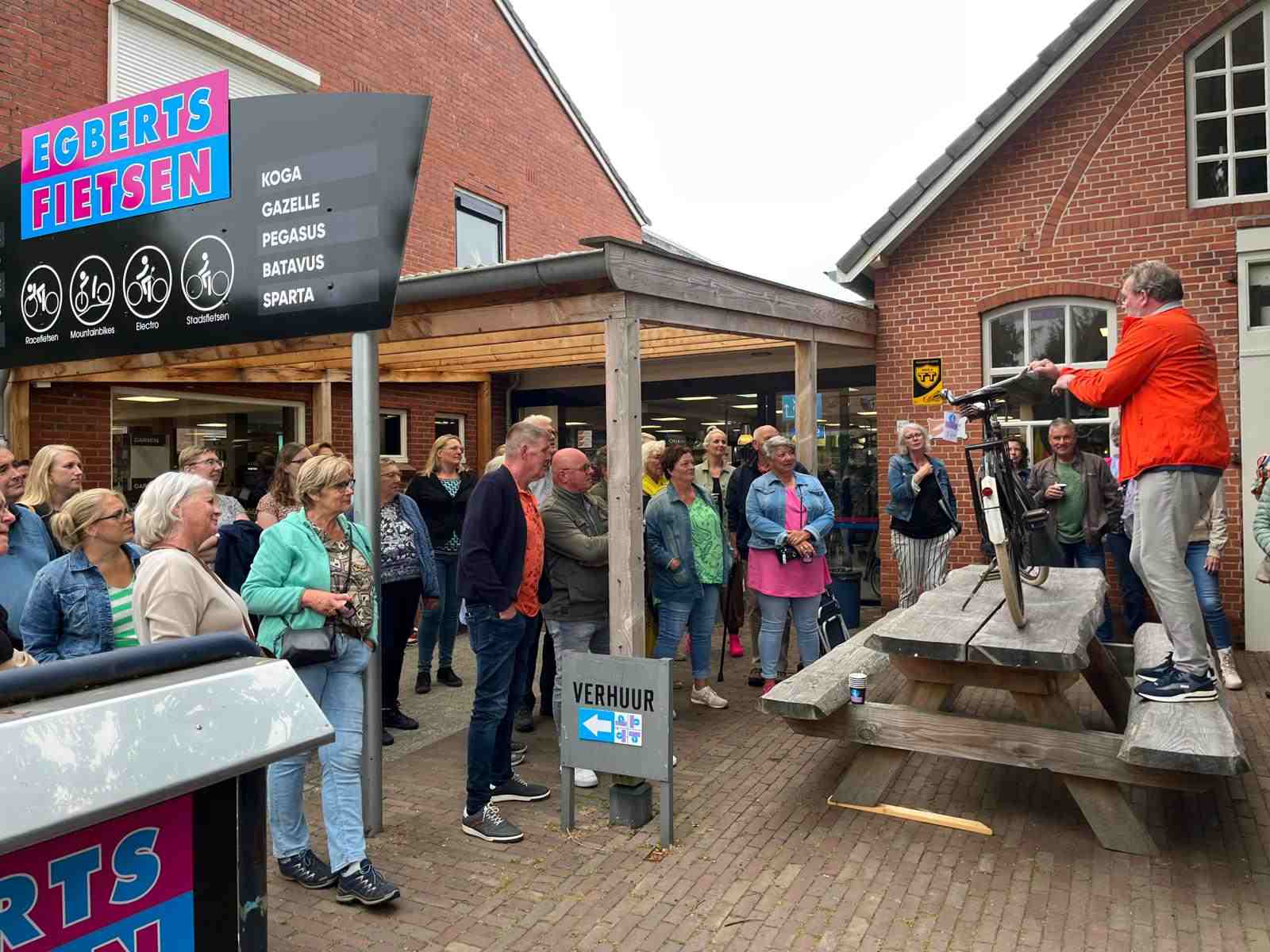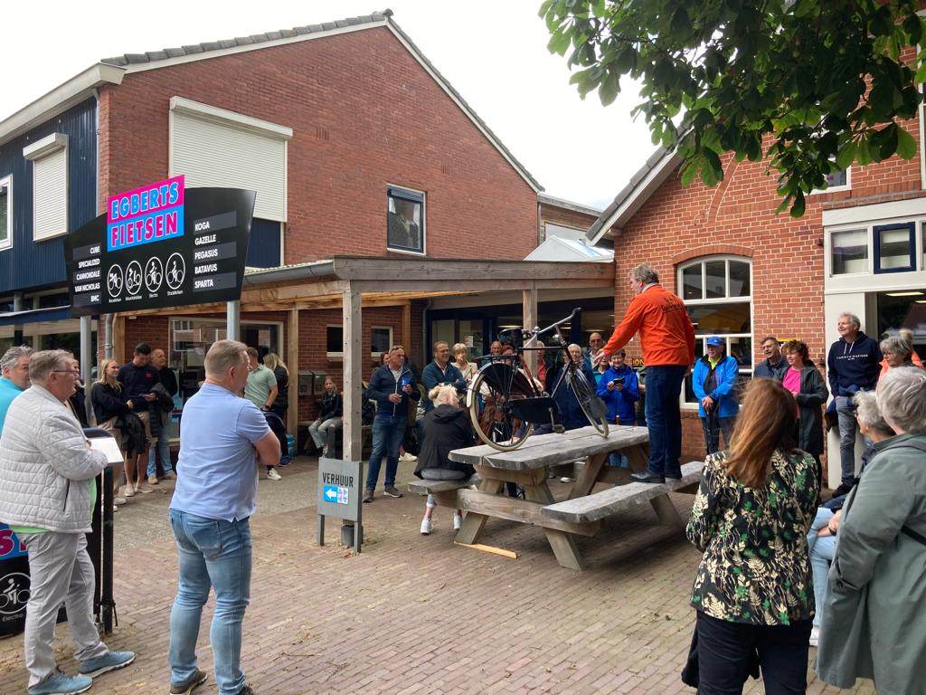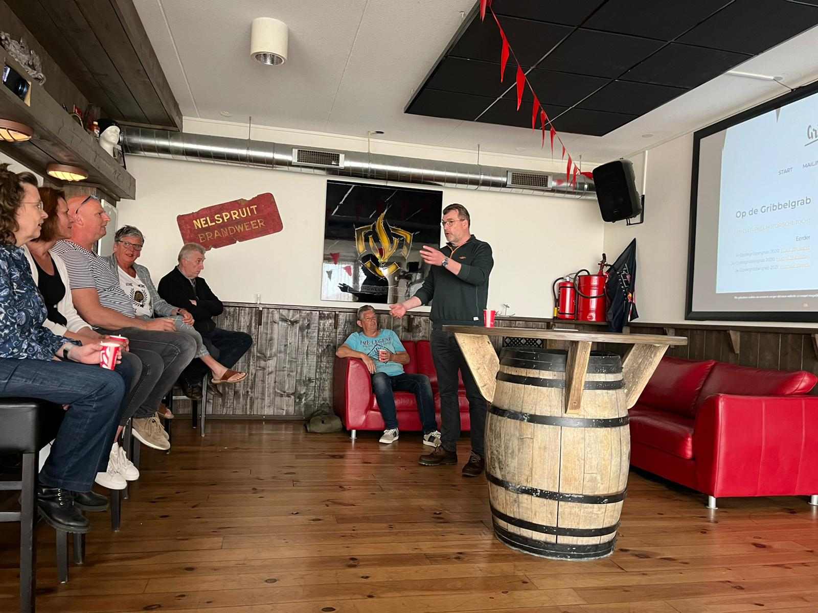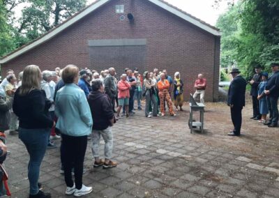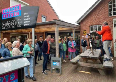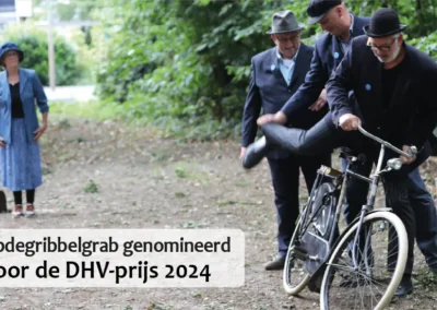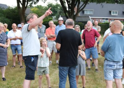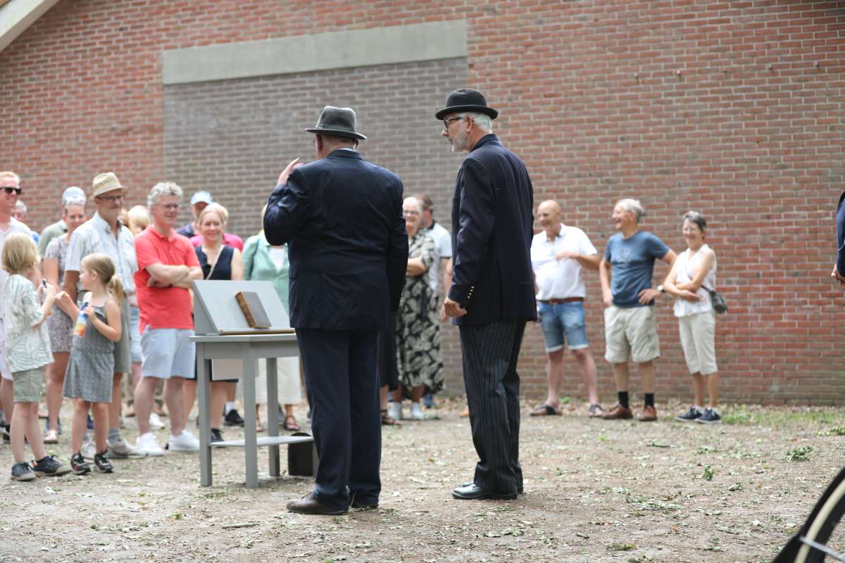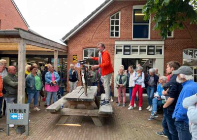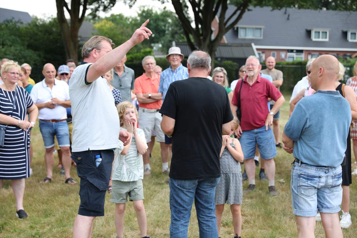 Deze Opdegribbelgrab was een tocht van maximaal 2 km en onderweg namen wij het publiek mee in sketches, poëzie en historische bijzonderheden. De route liep vanaf Egberts Fietsen via het Esdal College, het Padenbos, de begraafplaats, de tuin van Lammie Joling, de tuin van Peter Jan Eleveld en Ayolt van der Kamp, de voormalige gemeentewerf (met de tradionele Opdegribbelgrab-borrel), de tuin van familie de Vries en de tuin van familie Ties. Via het achterom bij Egberts Fietsen gingen we daarna naar de Esdal College (voormalige MAVO/MULO/ULO).