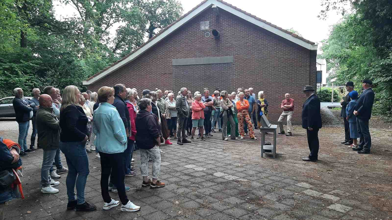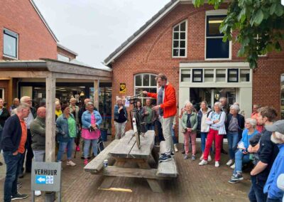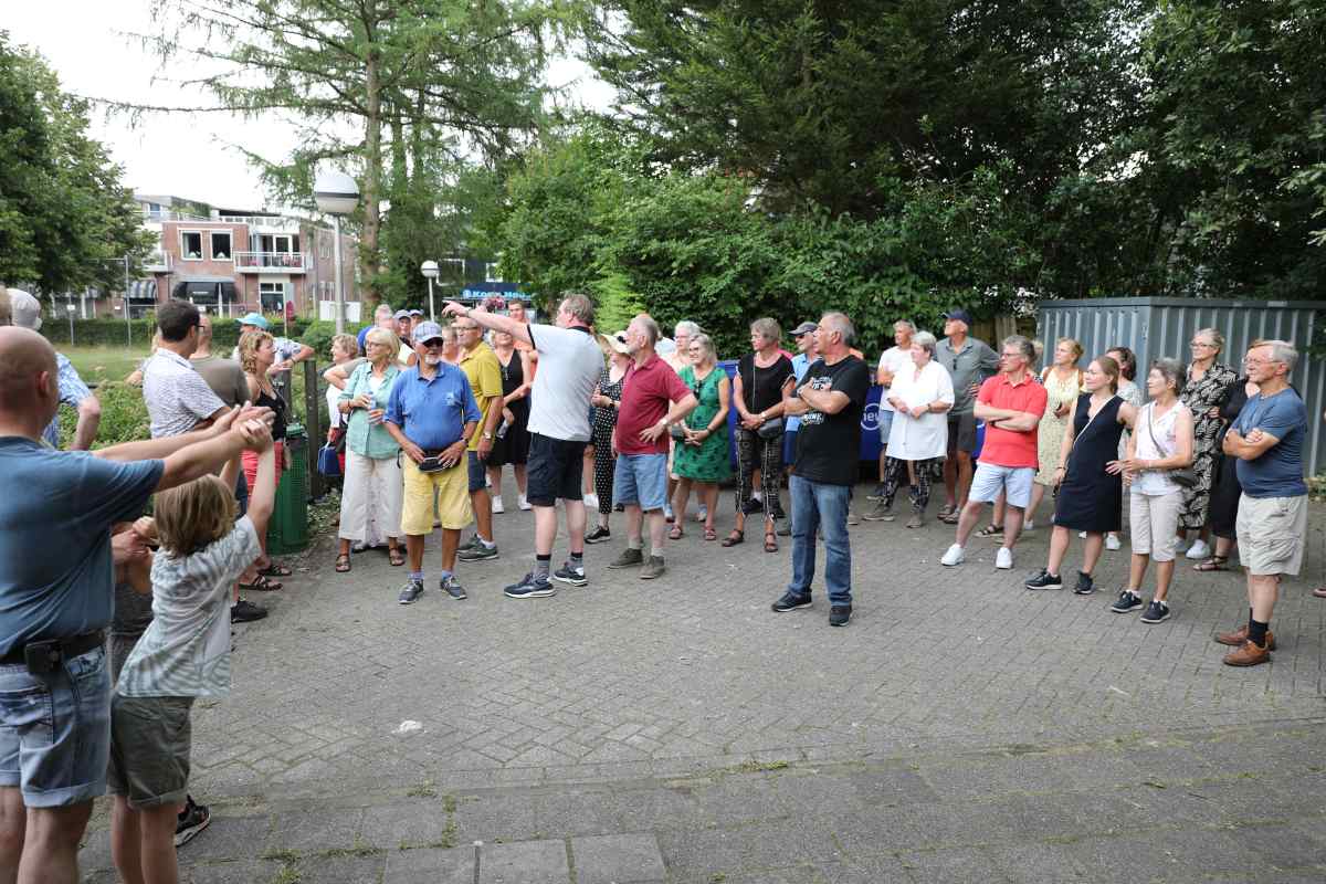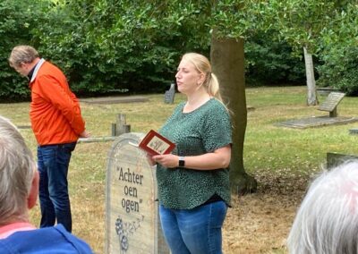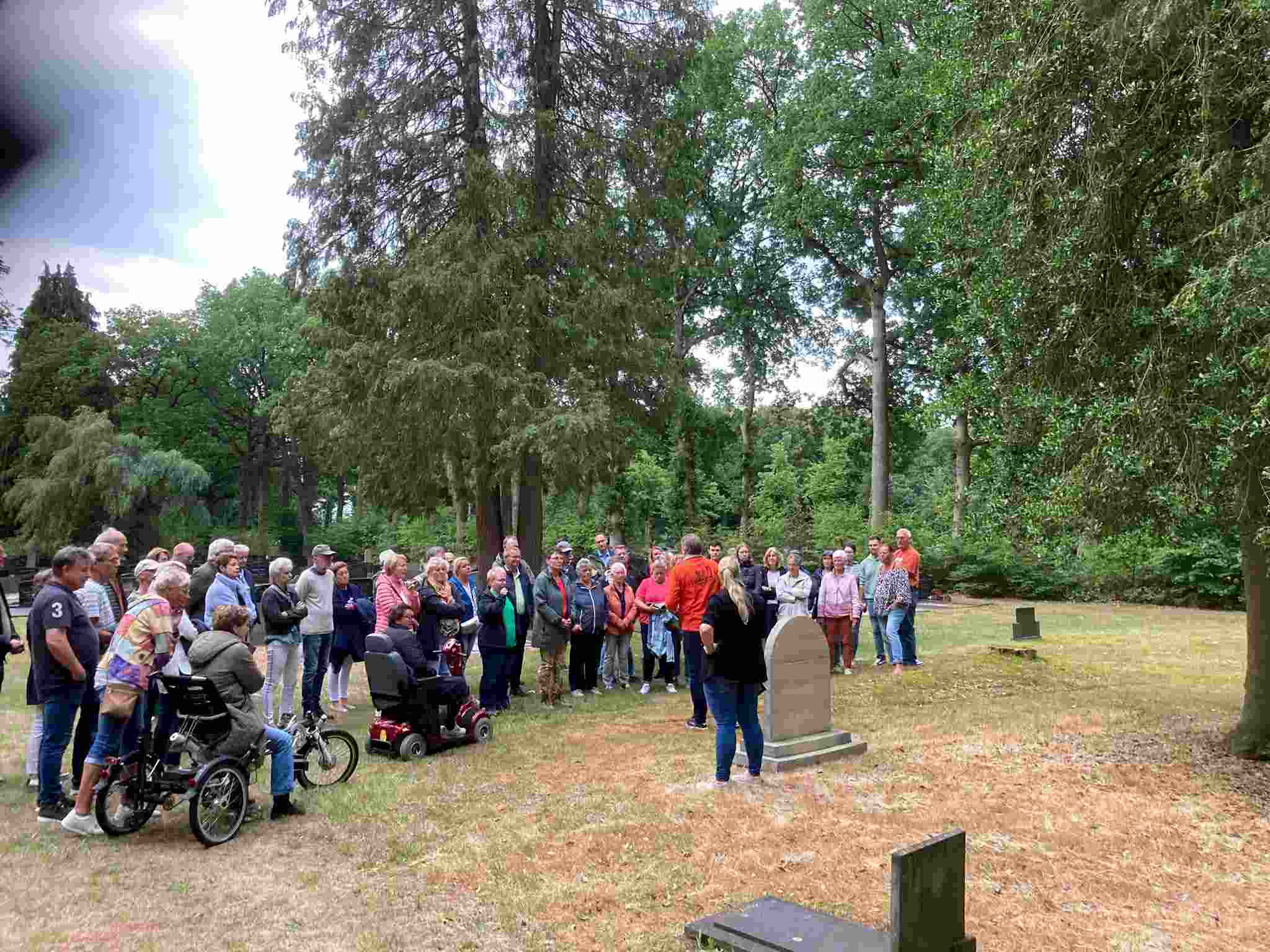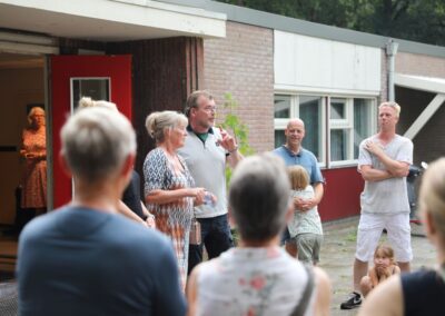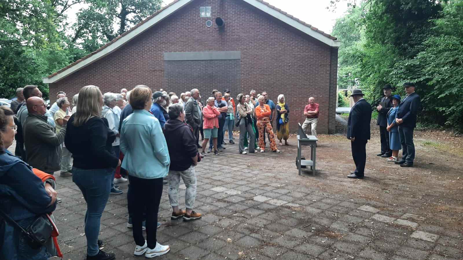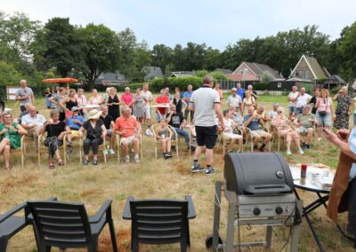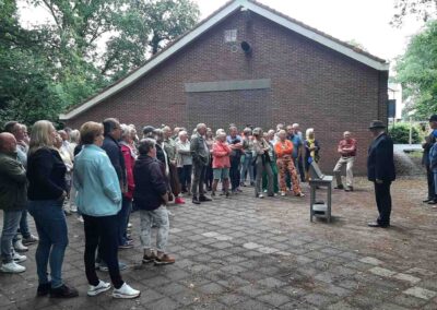 Deze Opdegribbelgrab was een tocht van maximaal 2 km en onderweg namen wij het publiek mee in sketches, poëzie en historische bijzonderheden. De route liep vanaf Egberts Fietsen via het Esdal College, het Padenbos, de begraafplaats, de tuin van Lammie Joling, de tuin van Peter Jan Eleveld en Ayolt van der Kamp, de voormalige gemeentewerf (met de tradionele Opdegribbelgrab-borrel), de tuin van familie de Vries en de tuin van familie Ties. Via het achterom bij Egberts Fietsen gingen we daarna naar de Esdal College (voormalige MAVO/MULO/ULO).