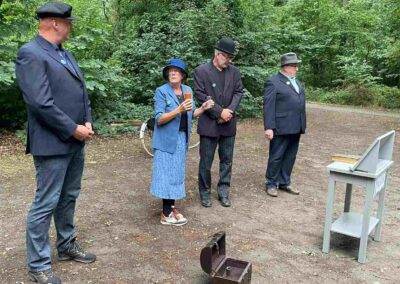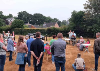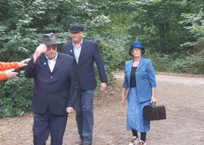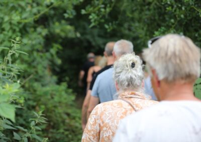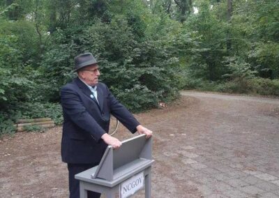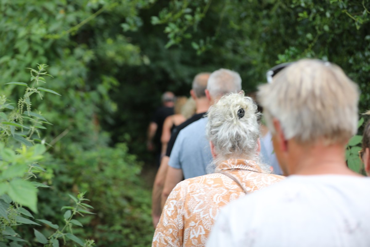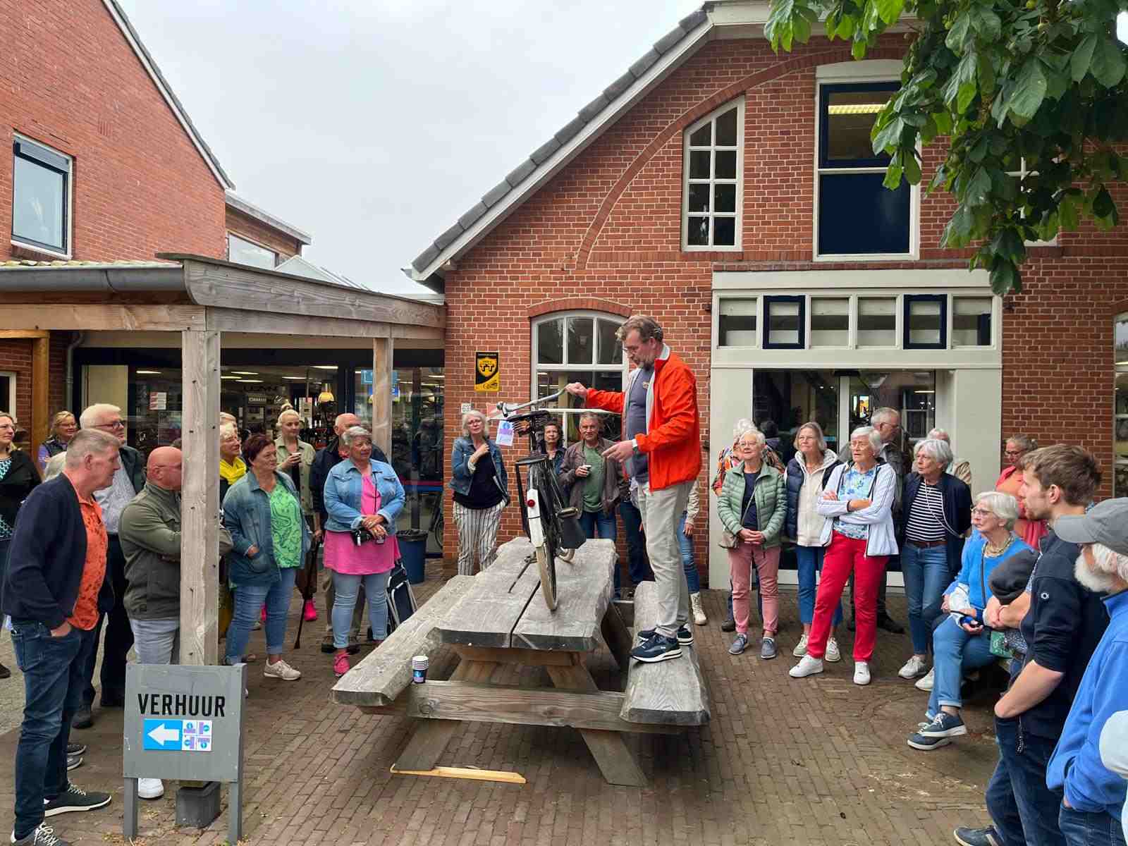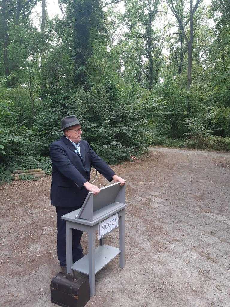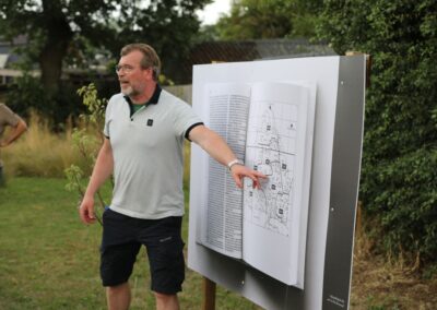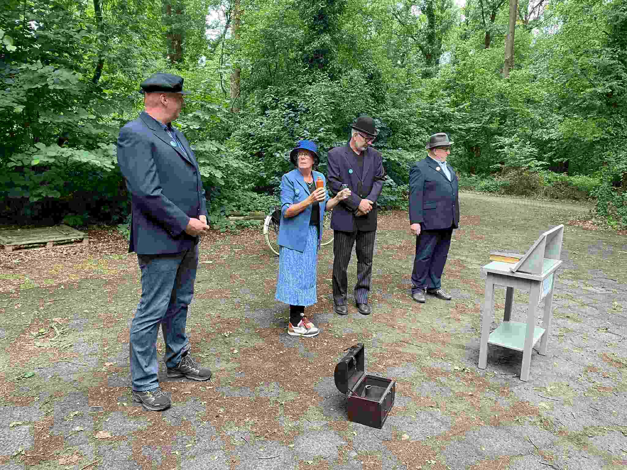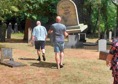 Deze Opdegribbelgrab was een tocht van maximaal 2 km en onderweg namen wij het publiek mee in sketches, poëzie en historische bijzonderheden. De route liep vanaf Egberts Fietsen via het Esdal College, het Padenbos, de begraafplaats, de tuin van Lammie Joling, de tuin van Peter Jan Eleveld en Ayolt van der Kamp, de voormalige gemeentewerf (met de tradionele Opdegribbelgrab-borrel), de tuin van familie de Vries en de tuin van familie Ties. Via het achterom bij Egberts Fietsen gingen we daarna naar de Esdal College (voormalige MAVO/MULO/ULO).