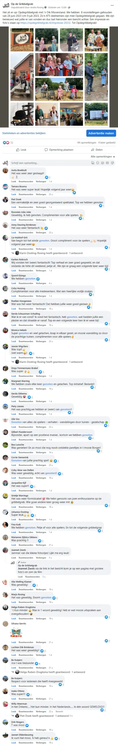 We hebben 8 voorstellingen op 28 juni, 1 juli, 2 juli, 5 juli, 8 juli en 9 juli 2023 gegeven voor circa 475 mensen.