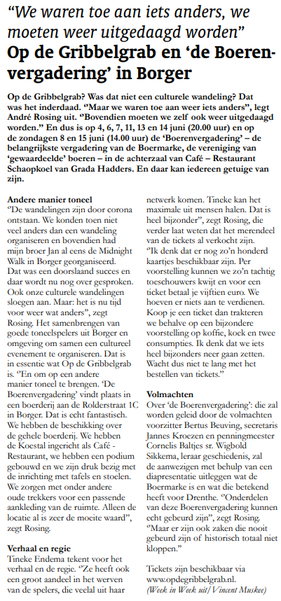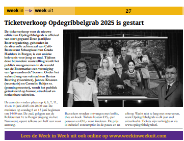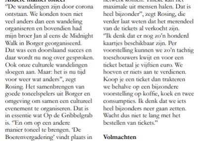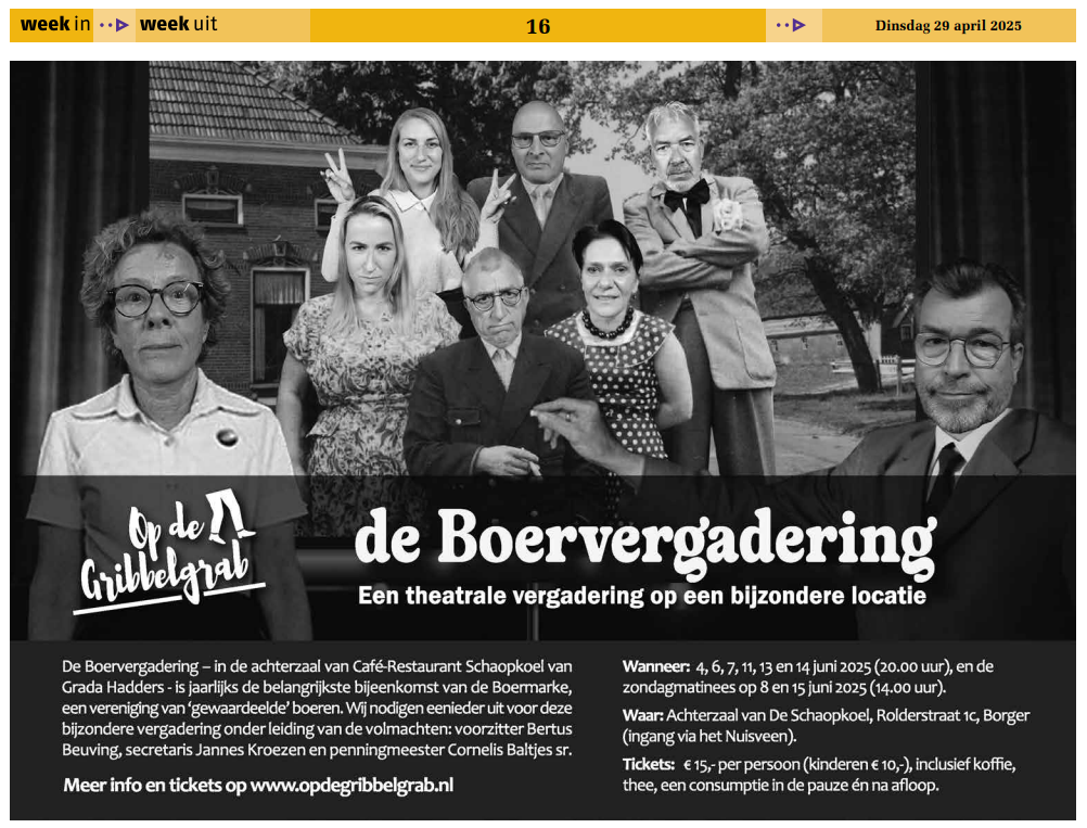 Bedankt voor de medewerking: Jan Rosing, Rene Edens, Harm Wilting, Rolien Boekholt, Grietje Egberts, Marjolein Reinds, Margreet van Delden en André Rosing (spelers). Tekst en regie: Tineke Endema. Decor en illustraties: Wim van Graas. Locatie: Roelof en Jesse Pott, Muziek Marco Warta en Wim Dekker. Ook bedanken wij de verkeersbegeleiders, de vrijwilligers voor de horeca o.l.v. Janny Rosing, de gastdames o.l.v. Henriëtte Duinkerken en een ieder die deze productie verder mogelijk heeft gemaakt.